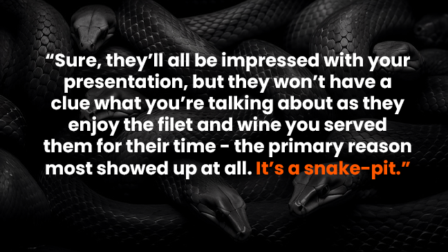 That’s where we come in because identifying these audiences was far easier before the iOS update that sent data accuracy spiraling out of control. Platforms suddenly couldn’t find the right person that is doing multiple investments of a minimum dollar amount that leans into your vertical with their investment dollars. The platforms no longer had app tracking data which allowed them to creep in on all of our data through our banking apps and brokerage account apps. While that’s a great thing for all of us, it crushed the big IR firm’s ability to hold the lock and key to the retail/private equity investor kingdom. The smaller IR firms have such a niche audience that crossover investment never happens. It is the equivalent to trying to sell emerging adtech to a group of elderly Pharma investors. Sure, they’ll all be impressed with your presentation, but they won’t have a clue what you’re talking about as they enjoy the filet and wine you served them for their time – the primary reason most showed up at all. It’s a snake-pit.